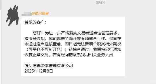 近日,一張關于銀河德睿資本管理有限公司(下稱“銀河德睿”)發送給客戶的通知在業內廣泛流傳。該通知顯示,這家期貨風險管理子公司為落實交易者適當性管理要求,需開展專項核查,期間將暫停新增個股類場外期權業務,但平倉業務可繼續進行。