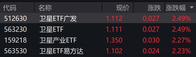 衛星概念股走強,臻鐳科技漲超12%,中國衛星漲超7%,航天電子、中國衛通漲超2%。