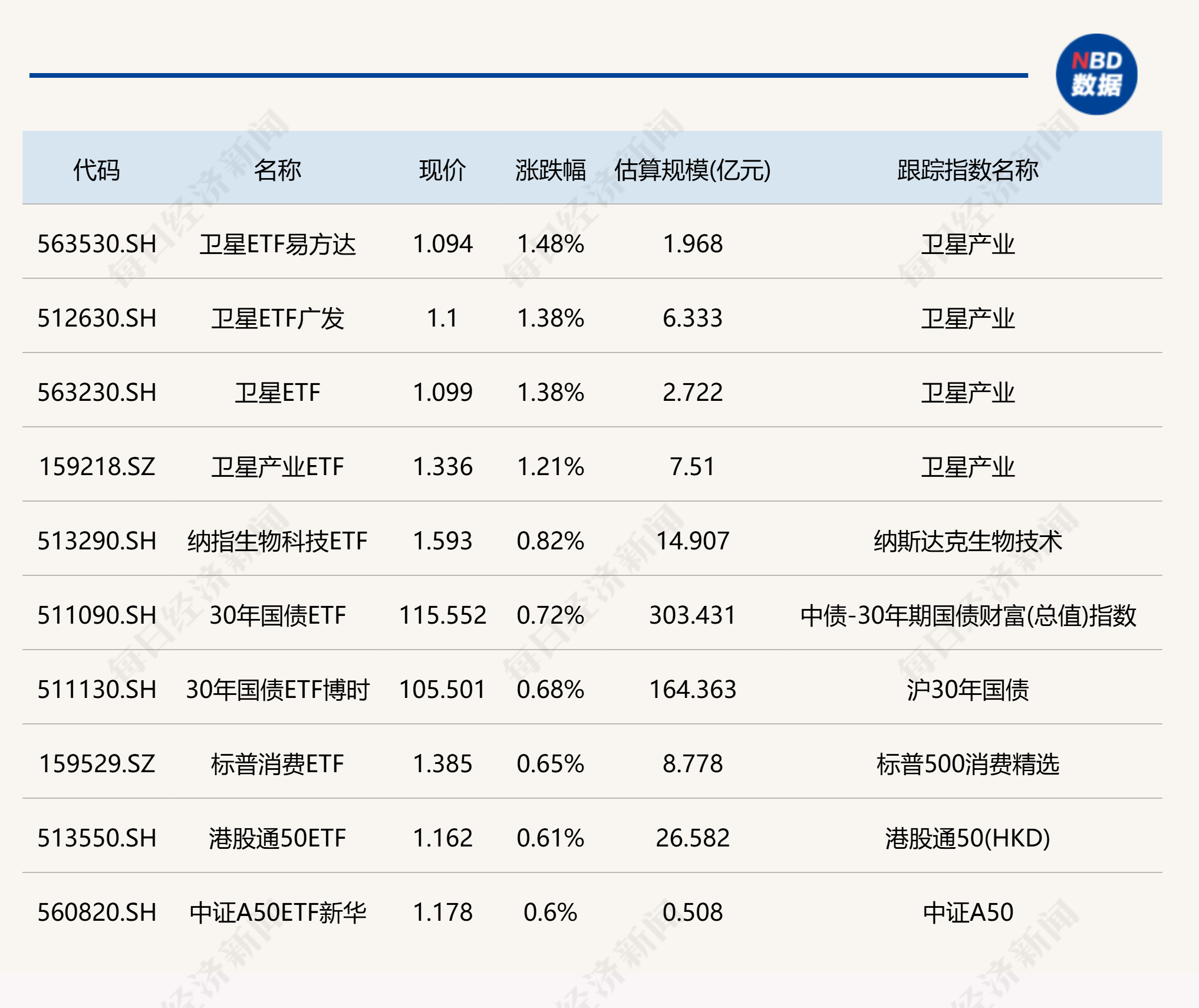 ETF漲跌幅方面,衛星相關ETF漲超1%。
