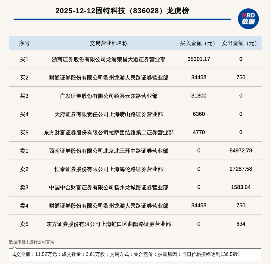 每經訊,2025年12月12日,新三板創新層公司固特科技(836028,收盤價:3.17元)登上龍虎榜,交易方式是集合競價,披露原因是當日價格振幅達到136.59%,成交數量3.61萬股,成交金額11.52萬元。買一席位為浙商證券股份有限公司龍游榮昌大道證券營業部,買入3.53萬元;賣一席位為西南證券股份有限公司北京北三環中路證券營業部,賣出8.5萬元。