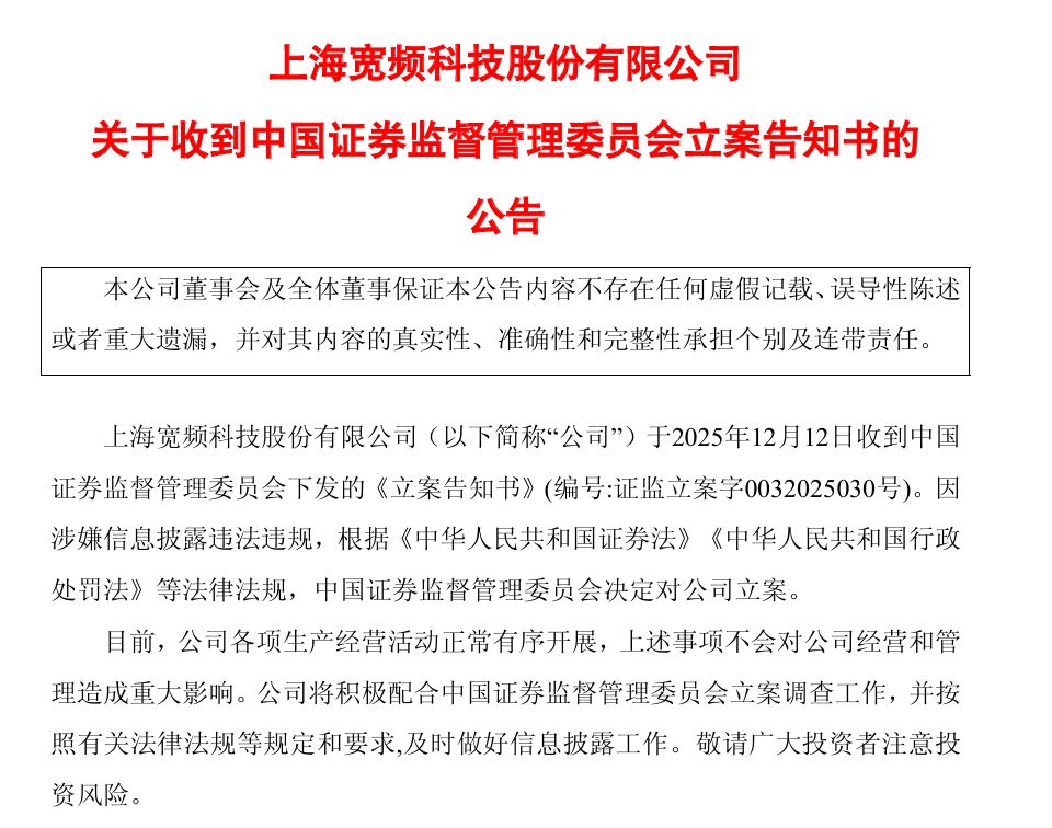 12月12日,*ST滬科公告稱收到中國證監會《立案告知書》,因涉嫌信息披露違法違規被立案。目前公司生產經營正常,該事項影響不大,公司將積極配合調查并做好信息披露。