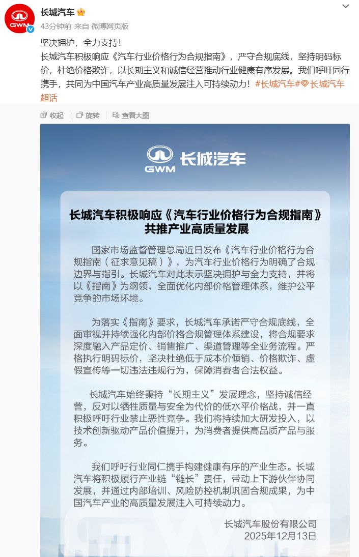 同日,長城汽車發文稱,積極響應《汽車行業價格行為合規指南》,嚴守合規底線,堅持明碼標價,杜絕價格欺詐,以長期主義和誠信經營推動行業健康有序發展。長城汽車承諾嚴守合規底線,全面審視井持續強化內部價格合規管理體系建設,將合規要求深度融入產品定價、銷售推廣,渠道管理等全業務流程。嚴格執行明碼標價,堅決杜絕低于成本價傾銷、價格欺詐、虛假宣傳等一切違法違規行為,保障消費者合法權益。