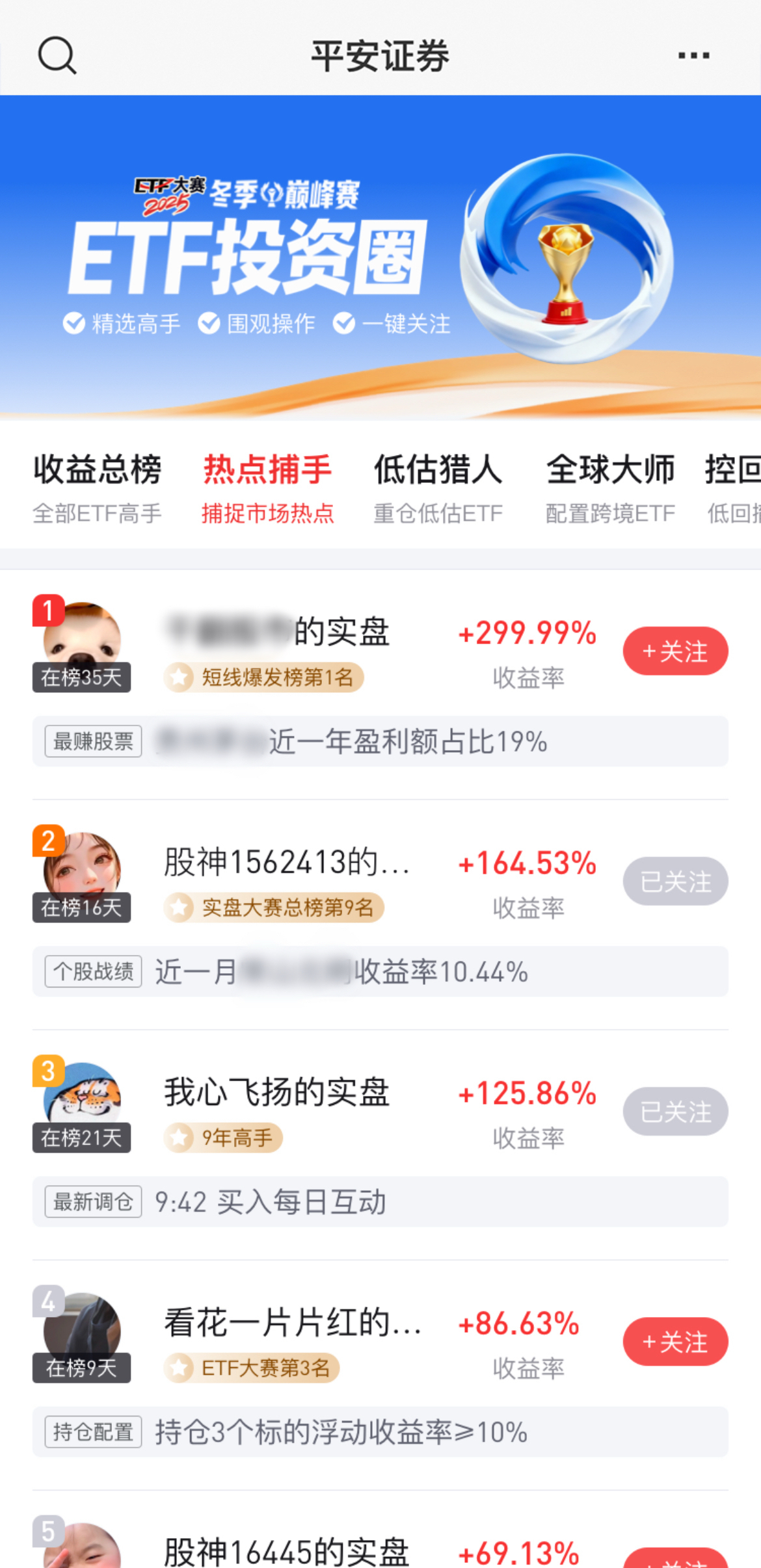 本次賽事以“找高手,加圈子”為主題,突破傳統(tǒng)投資競(jìng)賽模式,在平安證券APP上線全新的“ETF投資圈”頁(yè)面,并依據(jù)策略類型劃分出四大核心圈層——“低估獵手圈”“控回撤高手圈”“全球大師圈”及“熱點(diǎn)捕手圈”。不同風(fēng)險(xiǎn)偏好與投資習(xí)慣的投資者可進(jìn)入相應(yīng)圈子,跟蹤學(xué)習(xí)高手的持倉(cāng)動(dòng)態(tài)與策略邏輯,在互動(dòng)中提升投資認(rèn)知、增強(qiáng)持有信心。