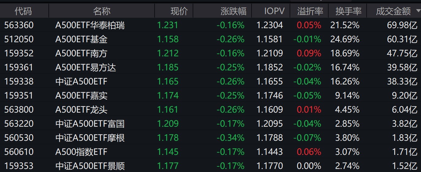 截至上午收盤,場內跟蹤中證A500指數的ETF小幅下跌。其中,有11只中證A500相關ETF成交額超1億元,3只超47億元。A500ETF華泰柏瑞、A500ETF基金、A500ETF南方早盤成交額分別為69.98億元、60.31億元、47.75億元。